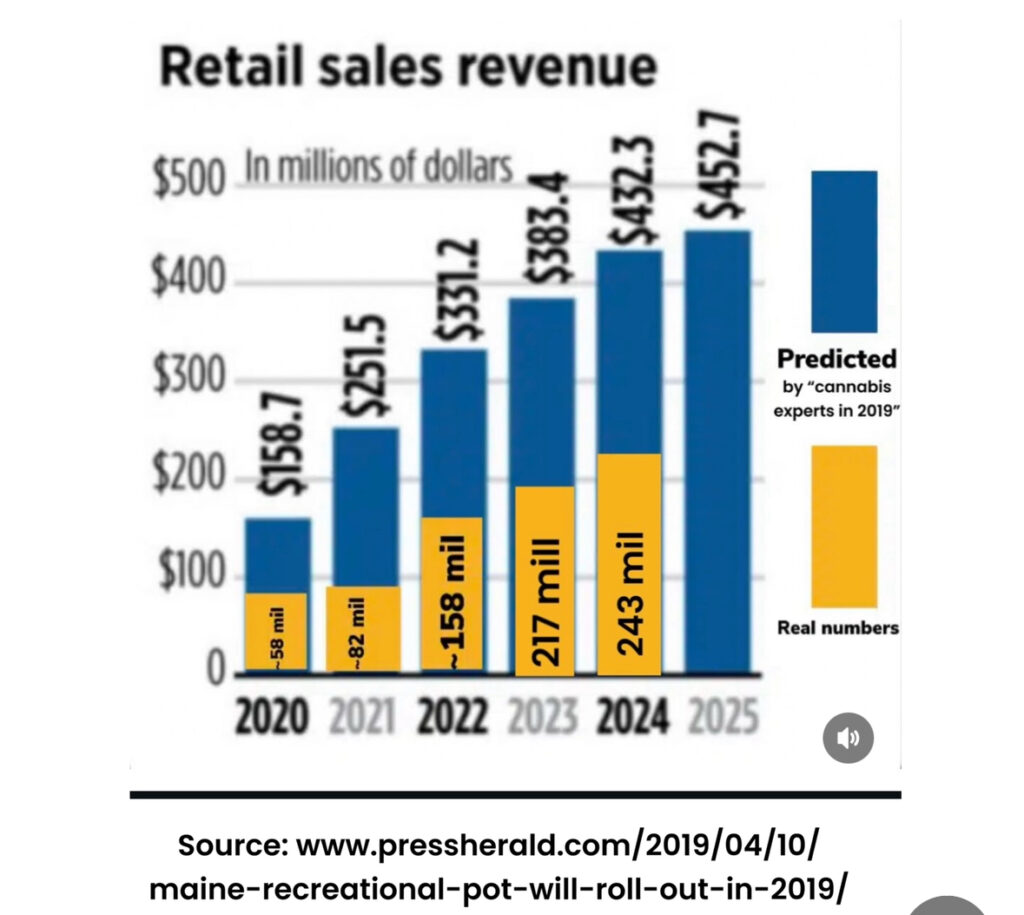 About those big sales projections. Back in 2019, three years after the vote and before the first legal sale, analysts were claiming adult-use sales in Maine would hit $452 million by 2025. Well, it’s 2025, and the program’s lucky if it breaks $250 million. That’s not growth — that’s a flop compared to expectations.